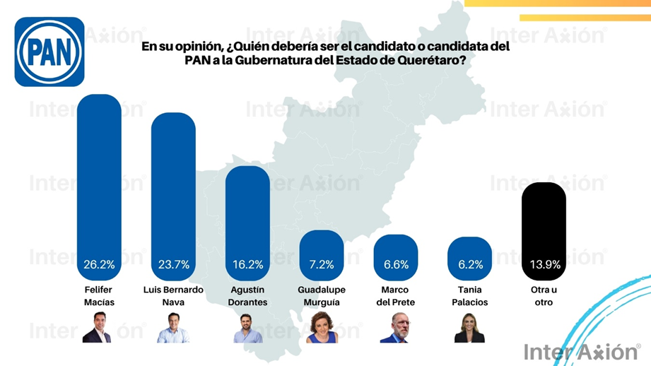 Nuevamente Felipe Fernando Macías y Luis Bernardo Nava, mantienen una amplia ventaja sobre el resto de las y los aspirantes, aunque también hay que decirlo, los reactivos de personas que optarían por otras opciones crecieron 3 puntos respecto del estudio anterior. En tercer lugar, de preferencias encontramos a Agustín Dorantes, y en cuarto a Guadalupe Murguía, quien se posiciona como la mujer con mayor preferencia dentro del partido.