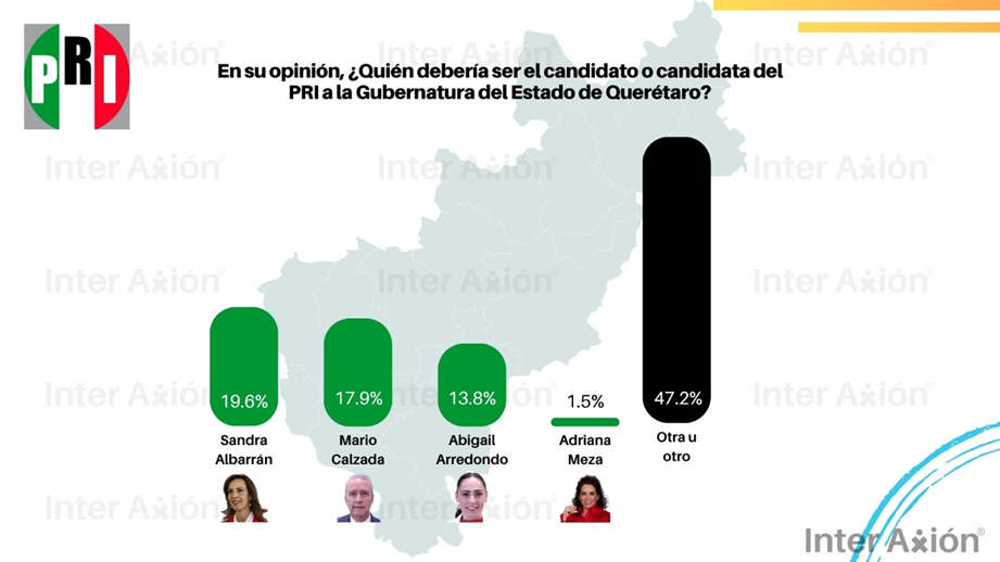 En el PRI, Sandra Albarrán mantiene ventaja sobre Mario Calzada, sin embargo lo hace con un margen más estrecho y en donde vale la pena considerar el ligero repunte en preferencias como partido que tuvo el PRI en este estudio de opinión. Esto podría ser un indicativo de que mientras más individuos del universo de reactivos simpatizan con el PRI, más crece la preferencia por Mario Calzada y Abigail Arredondo, quienes son perfiles políticos más actuales y vigentes que quien fuera la directora Estatal del DIF.