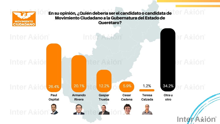 En Movimiento Ciudadano, Paul Ospital se despega considerablemente de Armando Rivera en un posicionamiento estatal, lo cual responde, en consideración con otros estudios de opinión, a que Paul tiene una mayor proyección estatal mientras que Armando Rivera tiene una imagen que permanece en la capital.